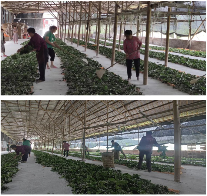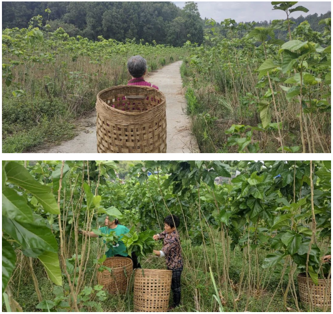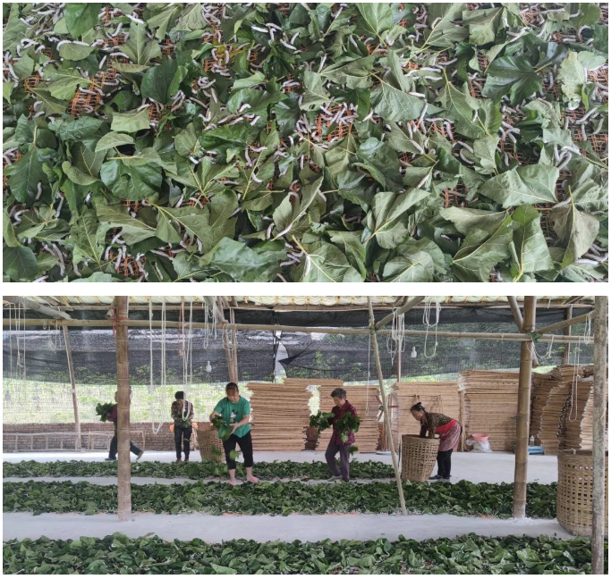 蠶房周圍全是種的桑樹,50余畝的桑園內(nèi),工人們穿梭其中,為蠶寶寶們采摘最新鮮的桑葉。