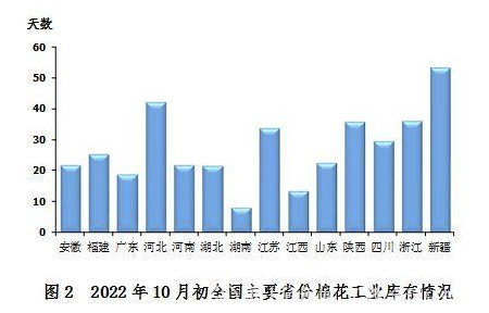 據(jù)國(guó)家棉花市場(chǎng)監(jiān)測(cè)系統(tǒng)對(duì)全國(guó)44個(gè)省市及自治區(qū)、69家紡織企業(yè)的抽樣調(diào)查顯示,截至2022年10月初,被抽樣調(diào)查企業(yè)棉花平均庫(kù)存使用天數(shù)約為26.9天(含到港進(jìn)口棉數(shù)量),環(huán)比減少3.5天,同比減少9.4天,比近五年(即2016-2021年,扣除2020年,下同)同期平均水平減少9.6天。推算全國(guó)棉花工業(yè)庫(kù)存約56.7萬(wàn)噸,環(huán)比減少11.4%,同比減少30.8%,比近五年同期平均水平減少28.8%(如表、圖1)。全國(guó)主要省份棉花工業(yè)庫(kù)存狀況不一,新疆、河北、浙江三省棉花工業(yè)庫(kù)存折天數(shù)相對(duì)較高(如圖2)。