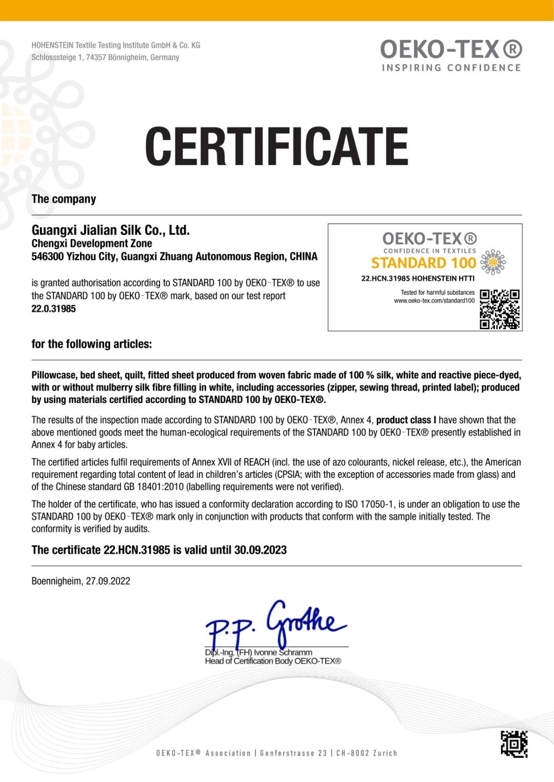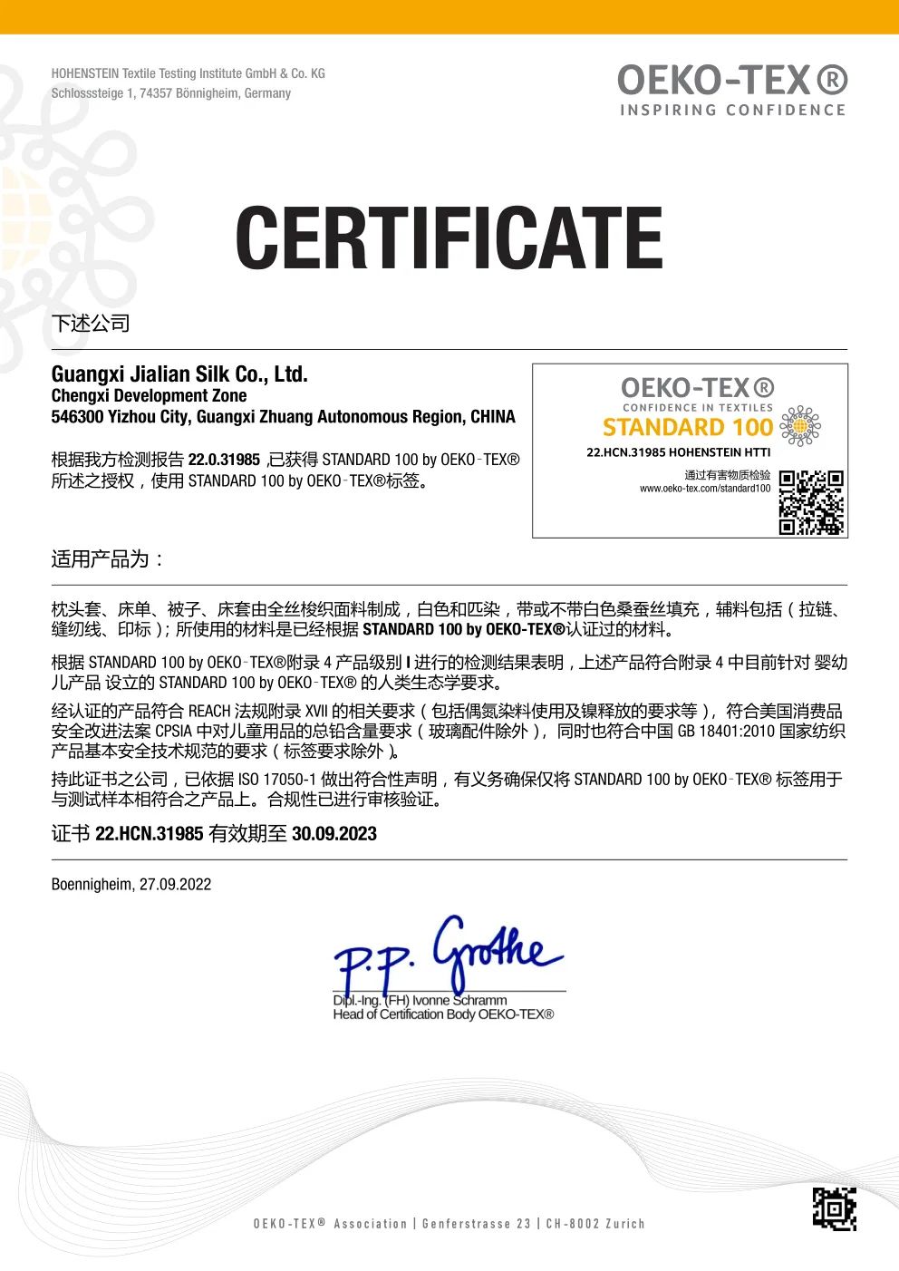 2022年10月,廣西嘉聯(lián)絲綢股份有限公司“南方絲巢”家紡產(chǎn)品成功通過“STANDARD 100 by OEKO-TEX”國際生態(tài)紡織品認證,符合STANDARD 100認證中最嚴格等級——I級嬰幼兒產(chǎn)品級別要求。德國海恩斯坦實驗室根據(jù)STANDARD 100檢測標準對“南方絲巢”系列產(chǎn)品進行了300多種有害物質(zhì)檢測,充分驗證其產(chǎn)品的高品質(zhì)與安全性。