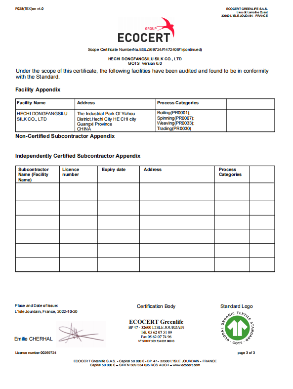 熱烈慶祝廣西河池市恒業(yè)集團東方絲路絲綢有限責任公司年產(chǎn)200噸有機生絲及60萬米有機坯綢,順利通過GOTS認證。這是廣西第一家通過此認證的絲綢企業(yè),為廣西絲綢行業(yè)的高質(zhì)量高規(guī)格發(fā)展起到了重要的榜樣作用。