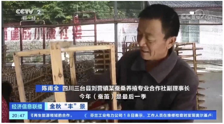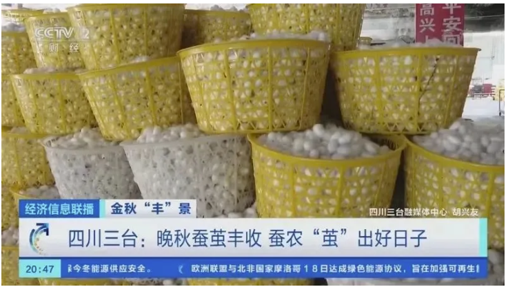 10月19日晚,中央廣播電視總臺CCTV-2《經(jīng)濟信息聯(lián)播》關注了綿陽市三臺縣晚秋蠶繭豐收情況,展現(xiàn)綿陽市蠶農通過走特色產業(yè)發(fā)展路子,用雙手掙出美好新生活。
