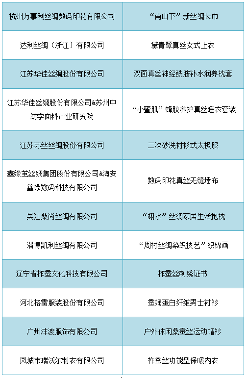 據(jù)不完全統(tǒng)計,除凱喜雅外,還有以下多家絲綢企業(yè)及繭絲綢面料產品入圍此次名單: