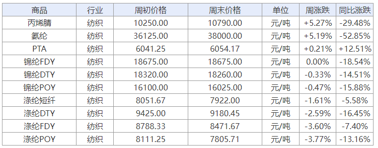 從上面的化纖榜單可以看出,當周化纖產(chǎn)品漲跌各不同,其中丙烯腈、氨綸價格漲勢搶眼,滌綸表現(xiàn)卻不盡如人意。具體來看: