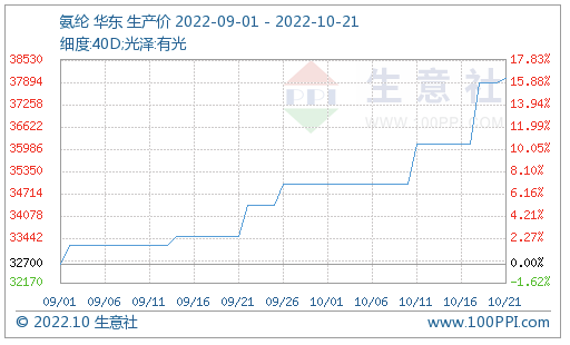 10月以來,國內(nèi)氨綸市場維持上行走勢,截止10月21日40D規(guī)格市場均價為38000元/噸,周漲幅5.19%。開工在7成附近,也有部分暢銷規(guī)格型號庫存低位,氨綸廠家報盤上漲。成本方面,原料PTMEG受成本BDO高位支撐,且新疆地區(qū)運輸偏緩,市場挺價為主;純MDI市場現(xiàn)貨偏緊,貿(mào)易商惜售,因此氨綸成本利好支撐不減。但下游終端客戶需求跟進謹慎、按需采買,持觀望心態(tài)。綜合來看,短期氨綸市場看漲情緒仍存。