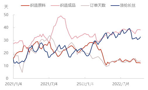 隆眾資訊統(tǒng)計(jì),截至10月20日,滌綸長(zhǎng)絲POY工廠庫(kù)存在31.3天,環(huán)比+5.03%;FDY工廠庫(kù)存在31.1天,環(huán)比+2.30%;DTY庫(kù)存在38.7天,環(huán)比+2.93%。上周雖滌綸長(zhǎng)絲工廠產(chǎn)銷略有好轉(zhuǎn),但多數(shù)時(shí)間產(chǎn)銷清淡,滌綸長(zhǎng)絲企業(yè)成品庫(kù)存進(jìn)一步累積。