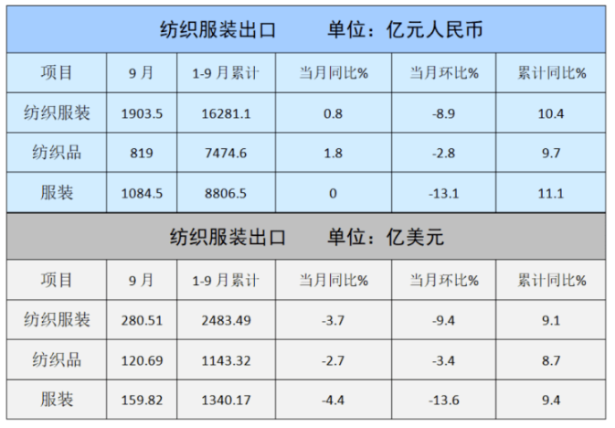 根據(jù)海關(guān)總署10月24日發(fā)布的最新數(shù)據(jù),按美元計,在主要市場需求下行因素的影響下,9月紡織服裝出口同比、環(huán)比均出現(xiàn)下降,但前三季度累計出口同比仍保持9.1%的較快增速。