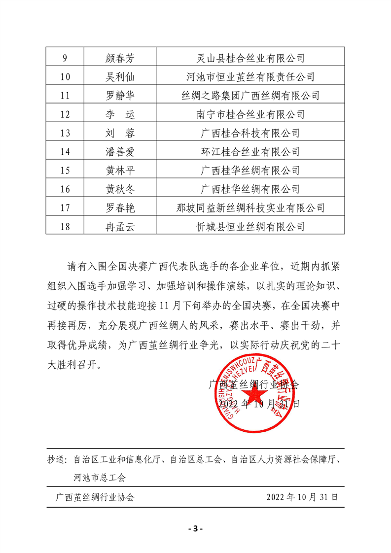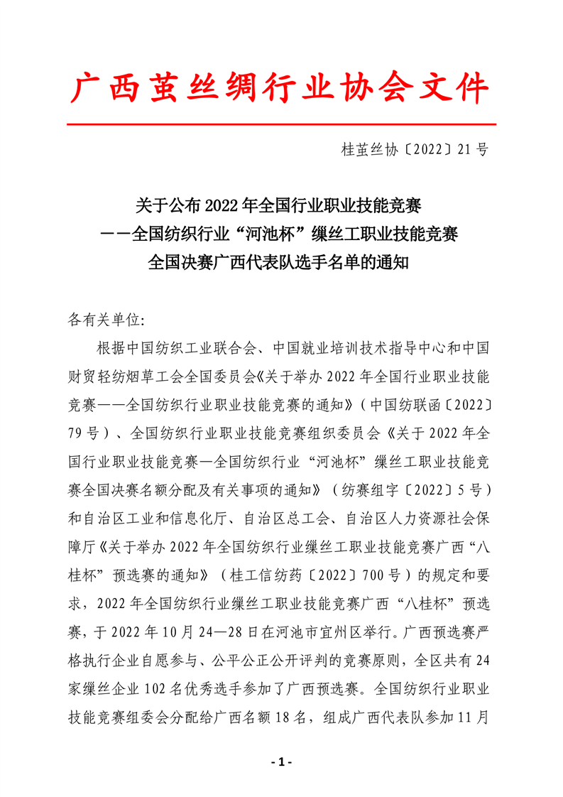 行業(yè)新聞丨關(guān)于公布2022年全國紡織行業(yè)河池杯繅絲工職業(yè)技能競賽決賽廣西代表隊(duì)選手名單的通知