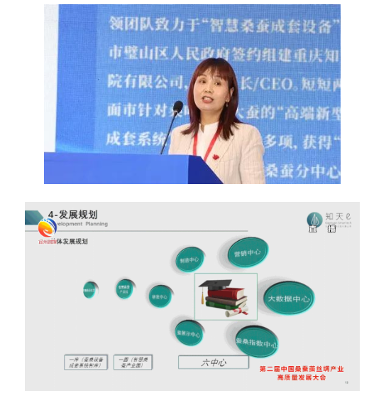 重慶知天而作農(nóng)業(yè)科技研究院有限公司董事長易麗女士作《智慧桑蠶助推我國桑蠶繭絲綢高質(zhì)量發(fā)展》主旨演講