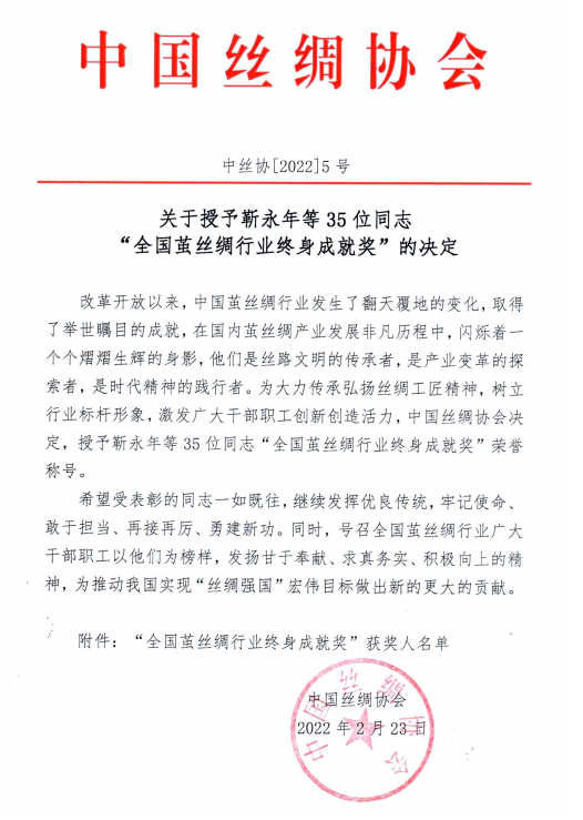 改革開放以來,中國繭絲綢行業(yè)發(fā)生了翻天覆地的變化,取得了舉世矚目的成就,在國內(nèi)繭絲綢產(chǎn)業(yè)發(fā)展非凡歷程中,閃爍著一個個熠熠生輝的身影,他們是絲路文明的傳承者,是產(chǎn)業(yè)變革的探索者,是時代精神的踐行者。為大力傳承弘揚絲綢工匠精神,樹立行業(yè)標(biāo)桿形象,激發(fā)廣大干部職工創(chuàng)新創(chuàng)造活力,中國絲綢協(xié)會決定,授予靳永年等 35 位同志“全國繭絲綢行業(yè)終身成就獎”榮譽稱號。