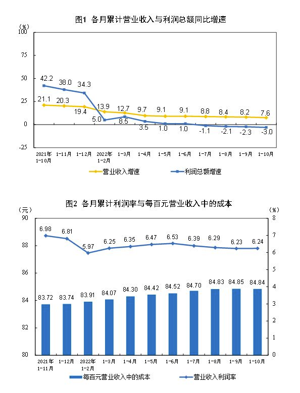 1—10月份,規(guī)模以上工業(yè)企業(yè)每百元營(yíng)業(yè)收入中的成本為84.84元,同比增加1.07元;每百元營(yíng)業(yè)收入中的費(fèi)用為7.91元,同比減少0.50元。