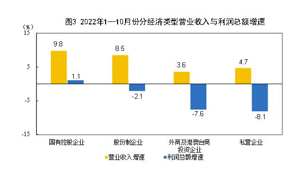 1—10月份,規(guī)模以上工業(yè)企業(yè)中,國(guó)有控股企業(yè)實(shí)現(xiàn)利潤(rùn)總額22648.9億元,同比增長(zhǎng)1.1%;股份制企業(yè)實(shí)現(xiàn)利潤(rùn)總額50877.4億元,下降2.1%;外商及港澳臺(tái)商投資企業(yè)實(shí)現(xiàn)利潤(rùn)總額16617.2億元,下降7.6%;私營(yíng)企業(yè)實(shí)現(xiàn)利潤(rùn)總額19641.2億元,下降8.1%。