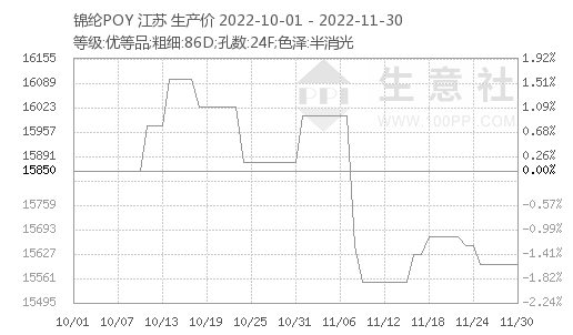 據(jù)生意社價格監(jiān)測顯示,11月,錦綸長絲價格趨弱下跌,截止2022年11月30日,江蘇地區(qū)錦綸長絲DTY(優(yōu)等品;70D/24F)報價17960元/噸,較月初價格下跌360元/噸,月跌幅1.97%;錦綸POY(優(yōu)等品;86D/24F)報價15600元/噸,較月初價格下跌400元/噸,月跌幅2.50%;錦綸FDY(優(yōu)等品:40D/12F)價格報18525元/噸,較月初價格下跌275元/噸,月跌幅1.46%。