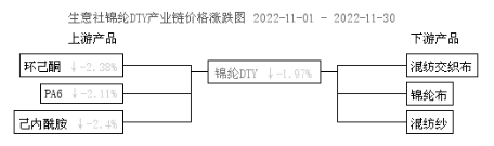 2022年11月,錦綸長絲市場上下游均利空影響,行情延續(xù)弱勢,價格下跌。市場內貨源供應保持充足穩(wěn)定,原料己內酰胺現(xiàn)貨供應充足,價格下跌,錦綸切片弱勢跟進,錦綸長絲成本端利空影響,企業(yè)報盤小幅下探。下游企業(yè)觀望氣氛加重,終端紡服消費仍顯不足,面料采購積極性不高,市場成交氣氛延續(xù)弱勢。