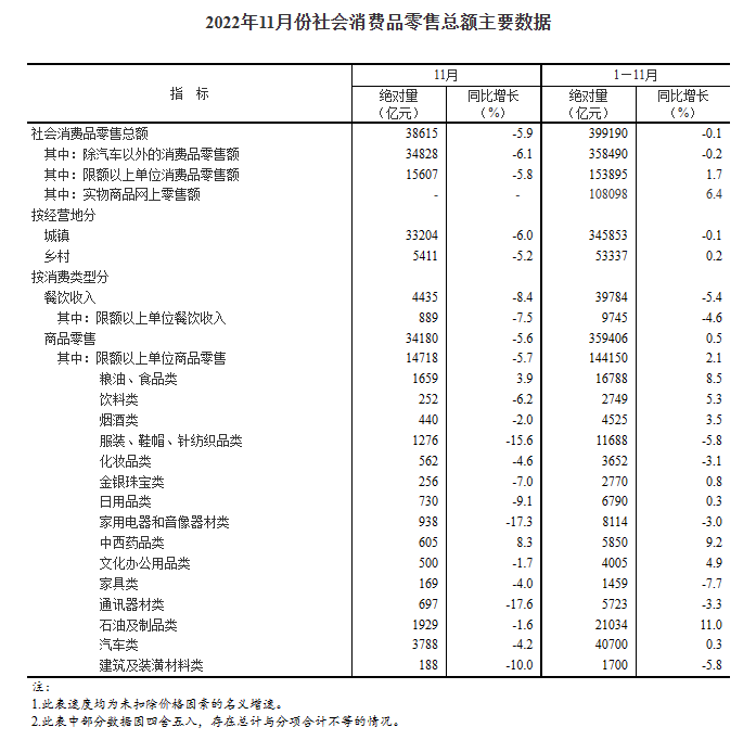 11月份,社會消費品零售總額38615億元,同比下降5.9%。其中,除汽車以外的消費品零售額34828億元,下降6.1%。