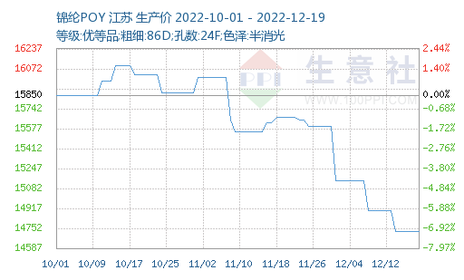 據(jù)生意社價格監(jiān)測顯示,上周(2022年12月12—18日),錦綸長絲價格價格趨弱下探,截止2022年12月18日,江蘇地區(qū)錦綸長絲DTY(優(yōu)等品;70D/24F)報價16980元/噸,較前一周價格下跌140元/噸,周跌幅0.82%;錦綸POY(優(yōu)等品;86D/24F)報價14725元/噸,較前一周價格下跌175元/噸,周跌幅1.17%;錦綸FDY(優(yōu)等品:40D/12F)價格報17750元/噸,較前一周價格下跌100元/噸,周跌幅0.56%。