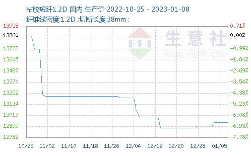 根據(jù)生意社價(jià)格監(jiān)測,上周(2023年1月2—8日)粘膠短纖價(jià)格微微上浮,截止至2023年1月8日,1.2D*38mm粘膠短纖國內(nèi)地區(qū)出廠報(bào)價(jià)為12940元/噸;較上周價(jià)格上漲40元/噸。 人棉紗價(jià)格弱勢平穩(wěn),截止至2023年1月8日(30S,環(huán)錠紡,一等品)出廠均價(jià)為17466元/噸,與上周價(jià)格持平。