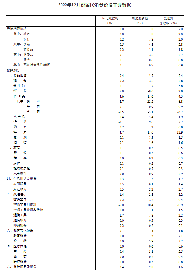 2022年12月份,全國居民消費(fèi)價(jià)格同比上漲1.8%。其中,城市上漲1.8%,農(nóng)村上漲1.8%;食品價(jià)格上漲4.8%,非食品價(jià)格上漲1.1%;消費(fèi)品價(jià)格上漲2.6%,服務(wù)價(jià)格上漲0.6%。