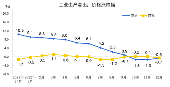 12月份工業(yè)生產(chǎn)者出廠價(jià)格(PPI)同比下降0.7%,環(huán)比下降0.5%;工業(yè)生產(chǎn)者購(gòu)進(jìn)價(jià)格同比上漲0.3%,環(huán)比下降0.4%。2022年全年,工業(yè)生產(chǎn)者出廠價(jià)格比上年上漲4.1%,工業(yè)生產(chǎn)者購(gòu)進(jìn)價(jià)格上漲6.1%。