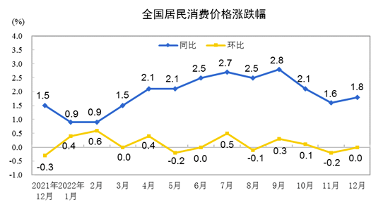 1月12日,國(guó)家統(tǒng)計(jì)局發(fā)布的數(shù)據(jù)顯示,中國(guó)2022年12月份居民消費(fèi)價(jià)格(CPI)同比上漲1.8%,漲幅符合市場(chǎng)預(yù)期,環(huán)比持平。2022年全年,全國(guó)居民消費(fèi)價(jià)格比上年上漲2%。