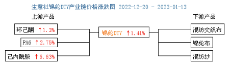 上周(2023年1月9—13日)上游端成本支撐,原料己內(nèi)酰胺現(xiàn)貨市場價(jià)格上漲,成本端支撐稍好,據(jù)生意社大宗榜數(shù)據(jù)顯示,1月8日國內(nèi)液體己內(nèi)酰胺市場均價(jià)為11233元/噸,1月13日國內(nèi)液體己內(nèi)酰胺市場均價(jià)為11766元/噸,較上周價(jià)格上漲533元/噸,周漲幅 4.74%。