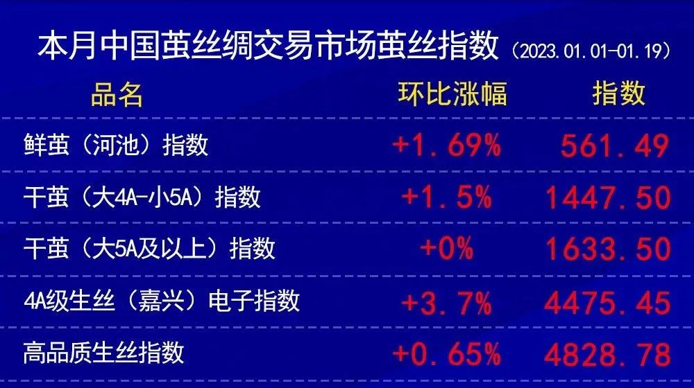元旦以來,雖然人民幣升值明顯,生絲對印度等主要市場成交不如前期,但交易商對疫情政策放開后的經(jīng)濟復(fù)蘇有良好的期待,和其他主要資本市場和商品品種一樣,繭絲品種均走出小幅上漲態(tài)勢。