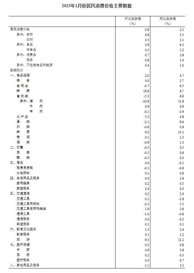 2023年1月份,全國(guó)居民消費(fèi)價(jià)格同比上漲2.1%。其中,城市上漲2.1%,農(nóng)村上漲2.1%;食品價(jià)格上漲6.2%,非食品價(jià)格上漲1.2%;消費(fèi)品價(jià)格上漲2.8%,服務(wù)價(jià)格上漲1.0%。