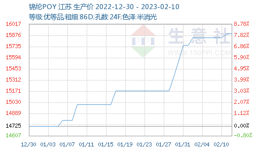 據(jù)生意社價(jià)格監(jiān)測(cè)顯示,上周(2023年2月6—2月10日),錦綸長(zhǎng)絲價(jià)格小幅上漲,截止2023年2月10日,江蘇地區(qū)錦綸長(zhǎng)絲DTY(優(yōu)等品;70D/24F)報(bào)價(jià)18240元/噸,較上周上漲80元/噸,周漲幅0.44%;錦綸POY(優(yōu)等品;86D/24F)報(bào)價(jià)15900元/噸,較上周上漲50元/噸,周漲幅0.32%;錦綸FDY(優(yōu)等品:40D/12F)價(jià)格報(bào)18975元/噸,較上周上漲50元/噸,周漲幅0.26%。