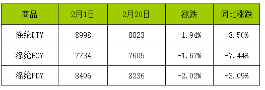 2月滌綸長絲市場均價漲跌情況單位:元/噸