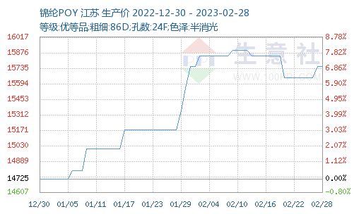 據生意社價格監(jiān)測顯示,2023年2月,錦綸長絲價格先漲后跌,截止2023年2月28日,江蘇地區(qū)錦綸長絲DTY(優(yōu)等品;70D/24F)報價18040元/噸,較月初價格上漲80元/噸;錦綸POY(優(yōu)等品;86D/24F)報價15750元/噸,與月初價格持平;錦綸FDY(優(yōu)等品:40D/12F)價格報18750元/噸與月初價格基本持平。