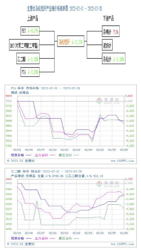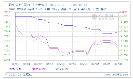 2月國(guó)內(nèi)滌綸短纖先抑后揚(yáng)價(jià)格小幅下跌。據(jù)生意社價(jià)格監(jiān)測(cè)顯示,2月28日國(guó)內(nèi)滌綸短纖現(xiàn)貨出廠均價(jià)為7402元/噸,較月初價(jià)格7652下跌3.27%,同比下跌4.72%。期貨市場(chǎng),月末短纖主力合約收于7212(結(jié)算價(jià)7166),較月初下跌3.45%。
