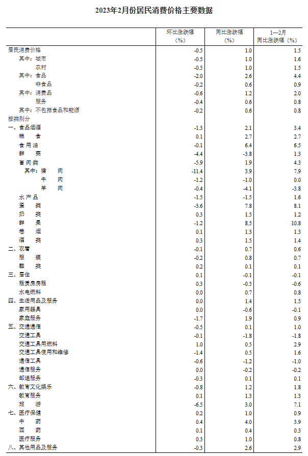 2023年2月份,全國(guó)居民消費(fèi)價(jià)格同比上漲1.0%。其中,城市上漲1.0%,農(nóng)村上漲1.0%;食品價(jià)格上漲2.6%,非食品價(jià)格上漲0.6%;消費(fèi)品價(jià)格上漲1.2%,服務(wù)價(jià)格上漲0.6%。1--—2月平均,全國(guó)居民消費(fèi)價(jià)格比上年同期上漲1.5%。