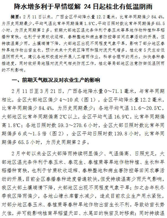 廣西:降水增多利于旱情緩解 24日起桂北有低溫陰雨