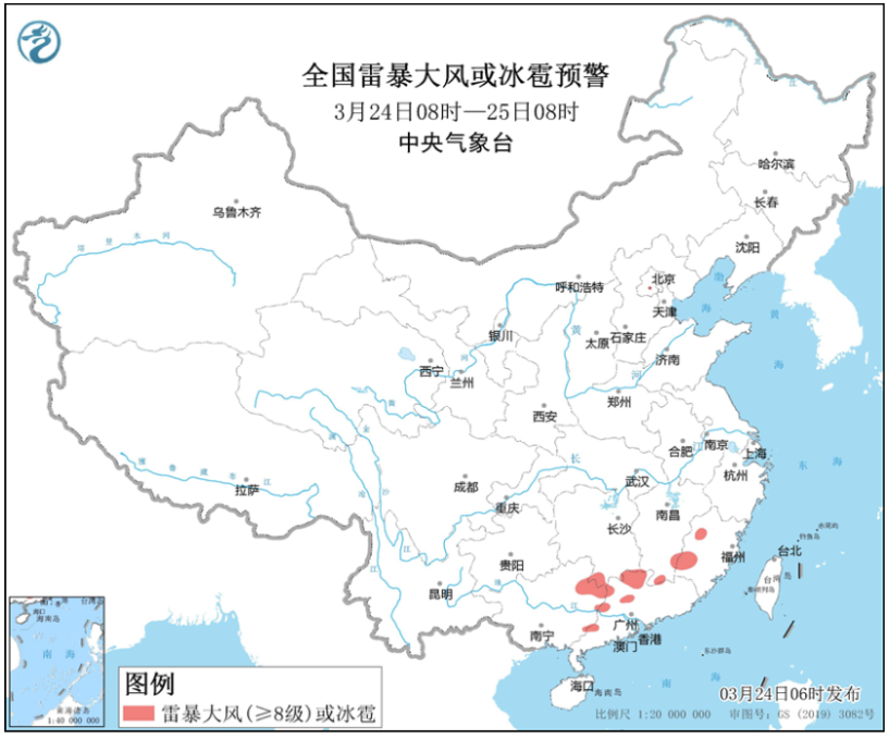 預(yù)計,3月24日08時至25日08時,湖南東南部、江西中南部、浙江南部、福建大部、廣西東北部、廣東西部和北部等地的部分地區(qū)有大到暴雨,其中,廣東西北部等地局地有大暴雨(100~110毫米)。上述部分地區(qū)伴有短時強(qiáng)降水(最大小時降雨量20~50毫米,局地可超過60毫米)。湖南南部、江西南部、福建西部、廣西東北部、廣東北部和西部等地的部分地區(qū)將有8-10級雷暴大風(fēng)或冰雹天氣(見圖1、圖2)。中央氣象臺3月24日06時繼續(xù)發(fā)布暴雨藍(lán)色預(yù)警和強(qiáng)對流天氣藍(lán)色預(yù)警。
