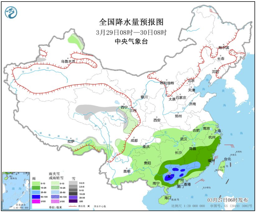 3月29日08時至30日08時,青海南部和東部、川西高原北部等地部分地區(qū)有小雪或雨夾雪。江南中東部和南部、華南大部等地部分地區(qū)有中到大雨,其中,廣西東部、廣東西部等地部分地區(qū)有暴雨(50~70毫米)。黑龍江西北部部分地區(qū)有4~5級風(fēng)(見圖3)。