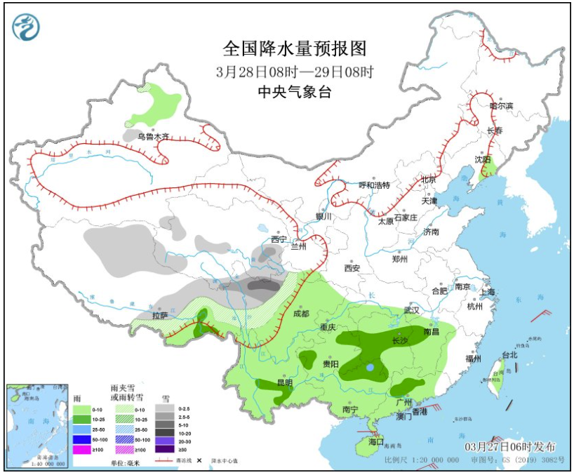 圖1 全國降水量預(yù)報圖(3月27日08時-28日08時)