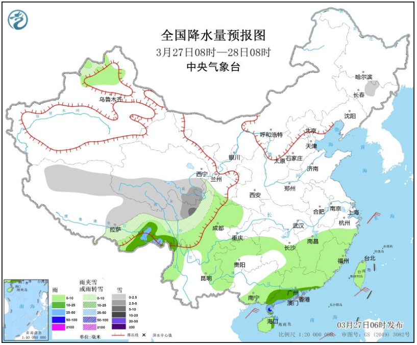 3月27日08時至28日08時,西藏北部和東部、青海南部、川西高原中北部等地部分地區(qū)有小雪或雨夾雪,其中,青海南部、甘肅南部、川西高原北部等地部分地區(qū)有中到大雪。西藏東南部、華南南部等地部分地區(qū)有中到大雨,其中,廣東西南部沿海局地有暴雨。東海南部、臺灣海峽、臺灣以東洋面、巴士海峽、南海北部、北部灣、瓊州海峽將有6~7級風(fēng)、陣風(fēng)8級,其中臺灣海峽部分海域風(fēng)力可達(dá)8級、陣風(fēng)9級(見圖1)。