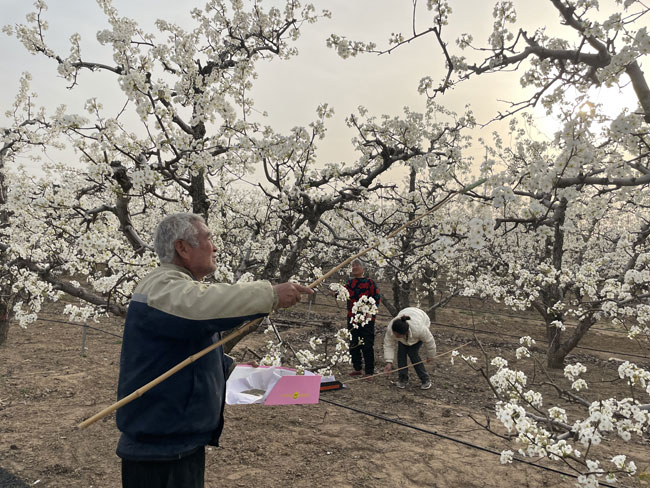 何寨村梨農正在為梨花人工授粉。人民網(wǎng)記者 李棟攝