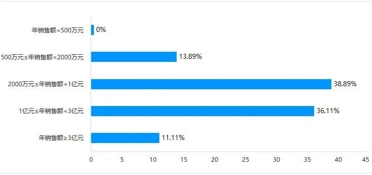 500萬元≤年銷售額<2000萬元的為 5家,占比為13.89%;2000萬元≤年銷售額<1億元的為14家,占比為38.89%;1億元≤年銷售額<3億元的為13家,占比為36.11%;年銷售額≥3億元的為4家,占比為11.11%。