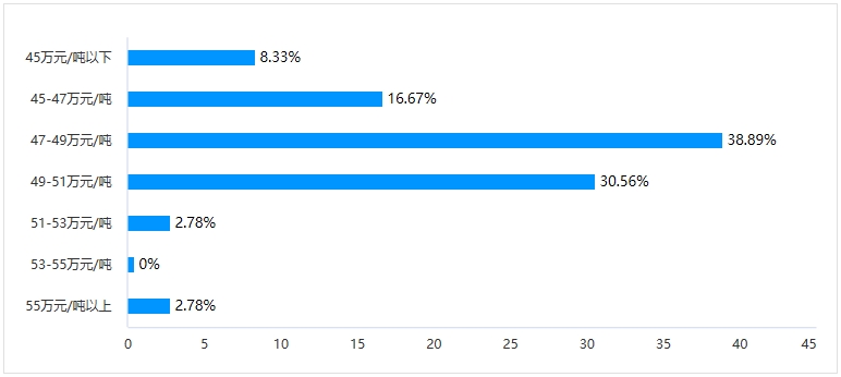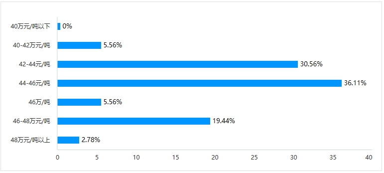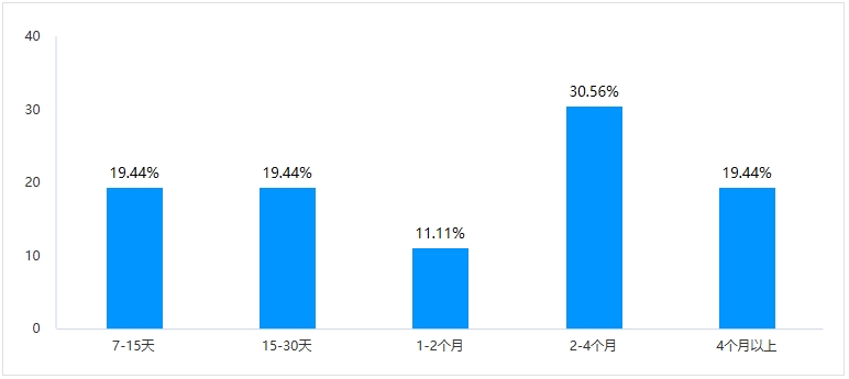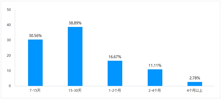 選擇7-15天的為11家,占比為30.56%;選擇15-30天的為14家,占比為38.89%;選擇1-2個月的為6家,占比為16.67%;選擇2-4個月的為4家,占比為11.11%;選擇4個月以上的為1家,占比為2.78%。