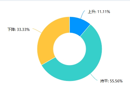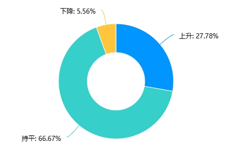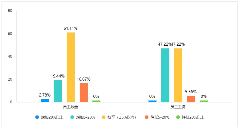 針對員工數(shù)量,選擇增加20%以上的1家,占比為2.78%;增加5-20%的為7家,占比為19.44%;選擇持平(±5%以內(nèi))的為22家,占比為61.11%;選擇降低5-20% 的為6家,占比為16.67%;選擇降低20%以上的,無。