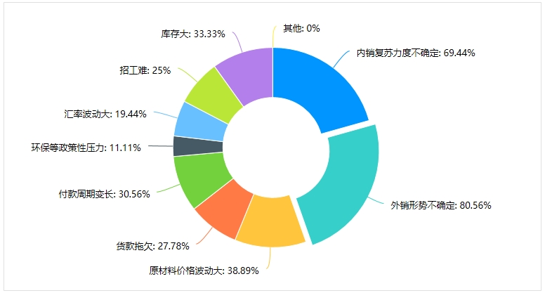 在內(nèi)銷復(fù)蘇力度不確定、外銷形勢不確定、原材料價格波動大、貨款拖欠、付款周期變長、環(huán)保等政策性壓力、匯率波動大、招工難和庫存大等認(rèn)為可能影響2023年企業(yè)經(jīng)營狀況的因素中,選擇外銷形勢不確定的有29家,占比為80.56%;選擇內(nèi)銷復(fù)蘇力度不確定的有25家,占比為69.44%;選擇原材料價格波動大的有14家,占比為38.89%;選擇庫存大的為12家,占比為33.33%;選擇付款周期變長的有11家,占比為30.56%;選擇貨款拖欠的為10家,占比為27.78%;選擇招工難 的有9家,占比為25%;選擇匯率波動大的為為7家,占比為19.44%;選擇環(huán)保等政策性壓力的為4家,占比為11.11%。