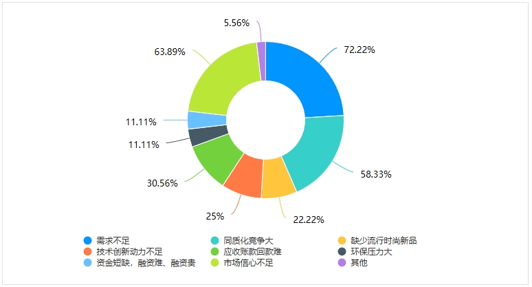 在需求不足、同質(zhì)化競爭大、缺少流行時尚新品、技術(shù)創(chuàng)新動力不足、應(yīng)收賬款回款難、環(huán)保壓力大、資金短缺,融資難、融資貴、市場信心不足等認(rèn)為產(chǎn)業(yè)當(dāng)前發(fā)展面臨的最主要問題中,選擇需求不足的為26家,占比72.22%;選擇市場信心不足的有23家,占比為63.89%;選擇同質(zhì)化競爭大的為21家,占比為58.33%;選擇應(yīng)收賬款回款難的為11家,占比為30.56%;選擇技術(shù)創(chuàng)新動力不足的有9家,占比為25%;選擇缺少流行時尚新品的有8家,占比為22.22%;選擇環(huán)保壓力大的為4家,占比為11.11%;選擇資金短缺、融資難、融資貴的為4家,占比為11.11%。其他中有企業(yè)還寫了努力做好、行業(yè)產(chǎn)能過剩。