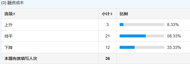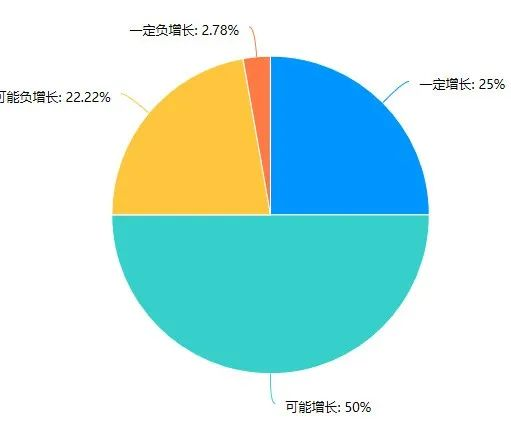 選擇一定增長的為9家,占比為25%;選擇可能增長的為18家,占比為50%;選擇可能負(fù)增長的為8家,占比為22.22%;選擇一定負(fù)增長的為1家,占比為2.78%。
