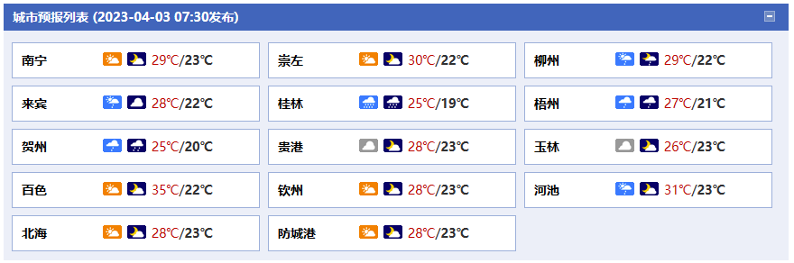 從昨晚20時至今天(3日)08時全區(qū)大部出現(xiàn)小雨,全區(qū)大部氣溫21~24℃。預計今天白天到晚上,大部地區(qū)依舊多雨,局部地區(qū)伴有短時雷暴大風、冰雹等強對流天氣,桂南部分地區(qū)的霧或回南潮濕天氣持續(xù)。提醒公眾,雨霧天路滑,能見度低,出行時需注意交通安全,還要注意防范,短時雷暴大風、冰雹等強對流天氣的出現(xiàn)。