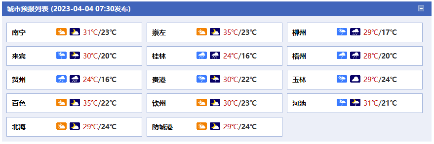 南寧市:今天白天到晚上,多云、局地有陣雨,回南潮濕天氣緩解,偏南風(fēng)2~3級(jí)、陣風(fēng)5~6級(jí),最低溫度23℃,最高溫度31℃。