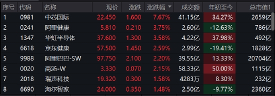 恒生科技指數(shù)(4237.63, 4.21, 0.10%)午后強(qiáng)勢(shì)翻紅,中芯國(guó)際漲近8%,阿里健康(5.81, 0.21, 3.75%)漲近4%,華虹半導(dǎo)體(37.6, 1.30, 3.58%)漲3.58%,京東健康(57.5, 1.45, 2.59%)、阿里巴巴漲超2%。