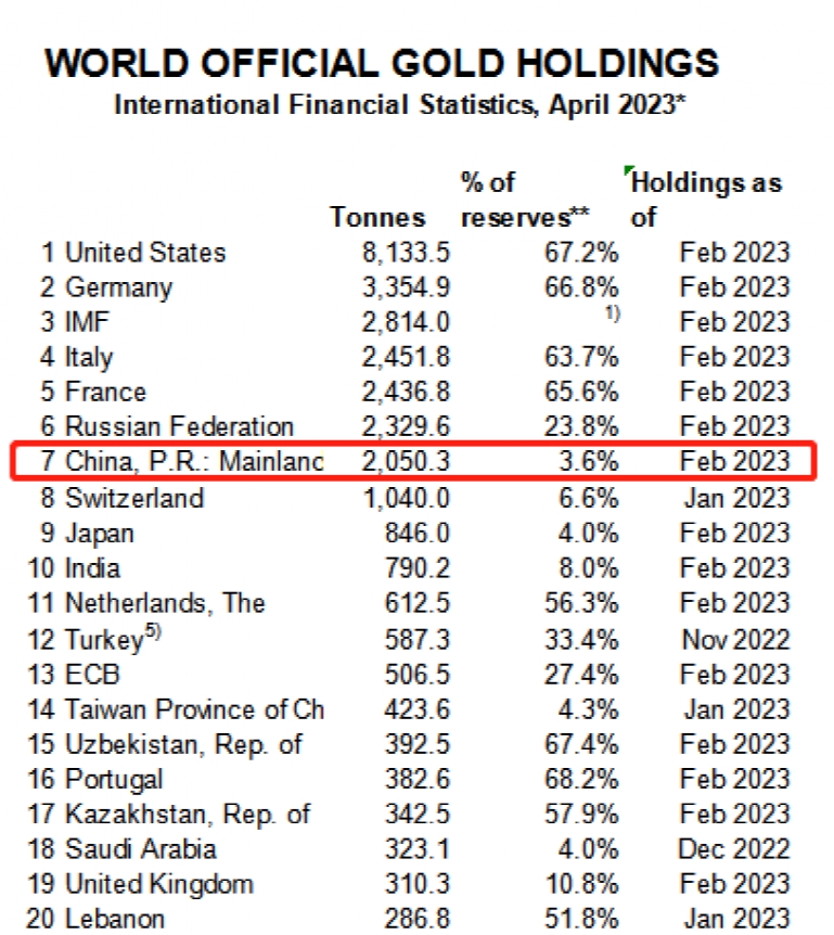 根據(jù)世界黃金協(xié)會最新公布數(shù)據(jù),截至今年2月末,美國黃金儲備最多,持有8133.5噸,占其總儲備的67.2%;德國排在第二位,3354.9噸的黃金儲備占其總儲備比例為66.8%;意大利、法國、俄羅斯分別排在4至6位,黃金儲備占比分別為63.7%、65.6%、23.8%。中國排在第七位,黃金儲備占比為3.6%,盡管黃金儲備總量相較于1月末有所增加,但占總儲備比例卻減少了0.1個百分點。