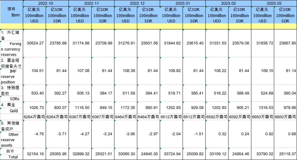 4月7日,國家外匯管理局數(shù)據(jù)顯示,截至2023年3月末,我國外匯儲備規(guī)模為31839億美元,較2月末增加507億美元,增幅為1.62%。其中,3月末我國黃金儲備達6650萬盎司,較上個月增加58萬盎司。