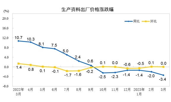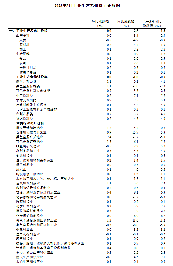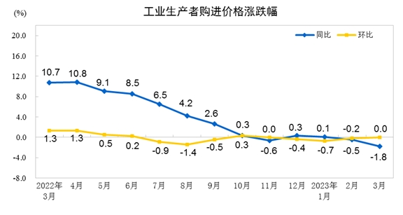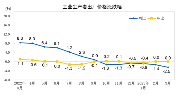 2023年3月份,全國工業(yè)生產(chǎn)者出廠價(jià)格同比下降2.5%,環(huán)比持平;工業(yè)生產(chǎn)者購進(jìn)價(jià)格同比下降1.8%,環(huán)比持平。一季度,工業(yè)生產(chǎn)者出廠價(jià)格比去年同期下降1.6%,工業(yè)生產(chǎn)者購進(jìn)價(jià)格下降0.8%。