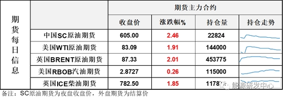 【1】WTI主力原油期貨收漲1.56美元,漲幅1.91%,報(bào)83.09美元/桶;布倫特主力原油期貨收漲1.72美元,漲幅2.01%,報(bào)87.33美元/桶;INE原油期貨收漲2.46%,報(bào)605元。